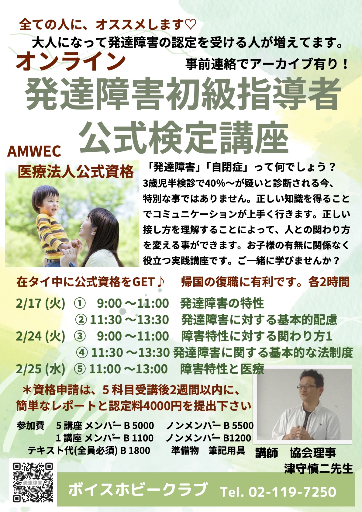 | 時 | 🍀2026年2月開講🍀 <Zoomレッスンへの変更に伴い日程も3日間に分けました🙏> ①発達障害の特性 2/17(火) 9:00〜11:00 ②発達障害に対する基本的配慮 2/17(火) 11:30〜13:30 ③障害特性に対する関わり方 2/24(火) 9:00〜11:00 ④発達障害に関する基本的な法制度 2/24(火) 11:30〜13:30 ⑤障害特性と医療 2/25(水) 11:00〜13:00 ※全てタイ時間です。 ※ご都合が合わない日がある方は、前日までのご連絡でアーカイブ受講OKです。 |
