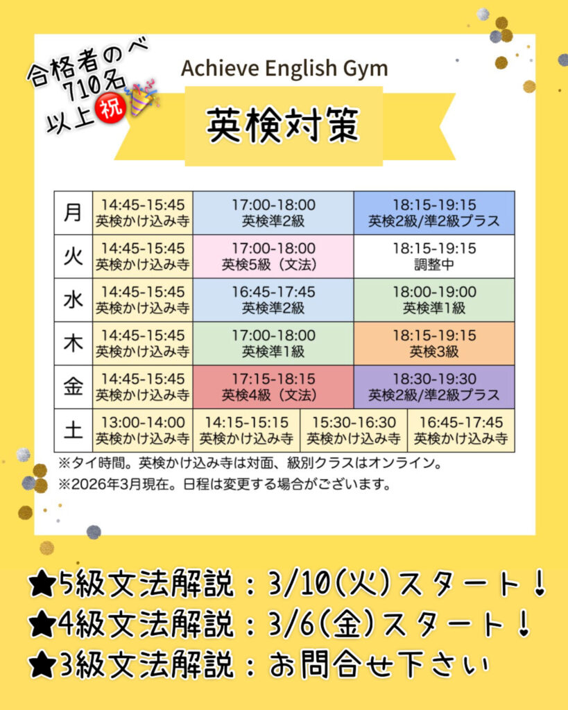 | 時 | <全10回> 上の表の通りです。 (2024年終了済み、2025年は通常クラスで文法解説を行なっています。) 特に上の級や普段英語に触れる機会が全くないお子様は、別途「オンライン英検対策」での過去問演習も合わせてのご受講がおすすめです。 また、3級以上のお子様は対面の「ライティング強化クラス」(ライティング添削あり)も合わせてご活用下さい。 ご参加できない日がある方は、お早目にご相談下さい。 |