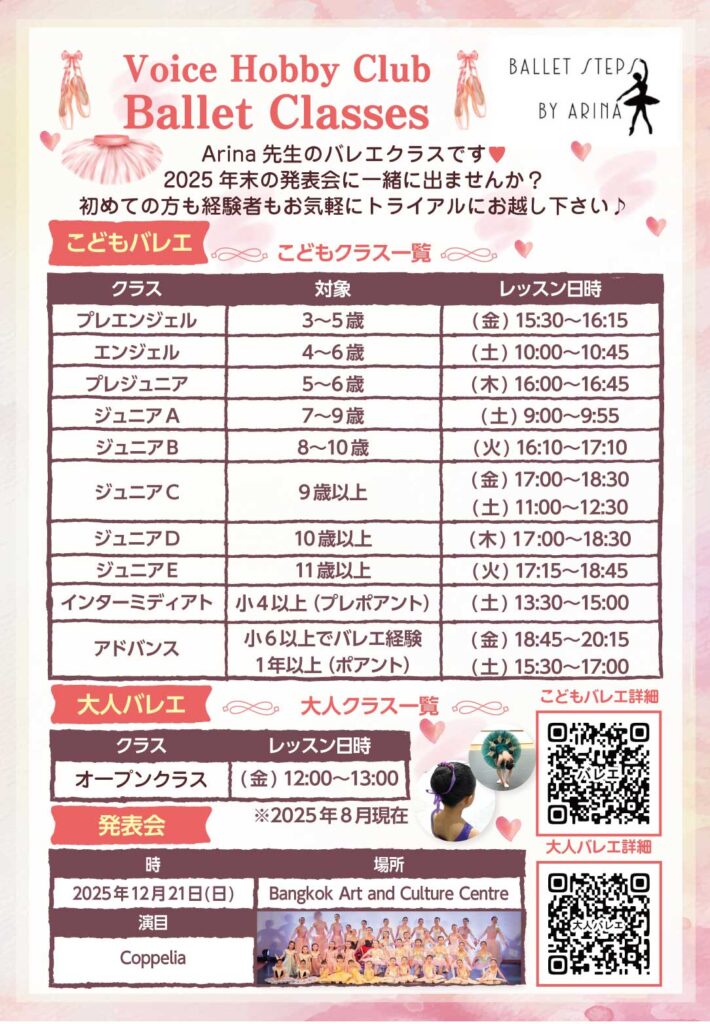| 時 | ❤️プレエンジェルクラス❤️ ※3〜5歳 毎(金) 15:30〜16:15 ❤️エンジェルクラス❤️ ※4〜6歳 ※英語OKのクラスです。 毎(土) 10:00〜10:45 ❤️プレジュニアクラス❤️ ※5〜6歳 毎(木) 16:00〜16:45 ❤️ジュニアA❤️ ※7〜9歳 毎(土) 9:00〜9:55 ❤️ジュニアB❤️ ※8〜10歳 毎(火) 16:10〜17:10 ❤️ジュニアC❤️ ※9歳以上 毎(金) 17:00〜18:30 毎(土) 11:00〜12:30 ❤️ジュニアD❤️ ※10歳以上 毎(木) 17:00〜18:30 ❤️ジュニアE❤️ ※11歳以上 毎(火) 17:15〜18:45 ❤️インターミディアト❤️ ※小4以上 ※プレポアント 毎(土) 13:30〜15:00 ❤️アドバンス❤️ ※小6以上で1年以上のバレエ経験者 ※ポアント ※定員7名 毎(金) 18:45〜20:15 毎(土) 15:30〜17:00 ❤️コンクール向け特別レッスン❤️ ※コンクール前に、それぞれの演目を練習します。 |